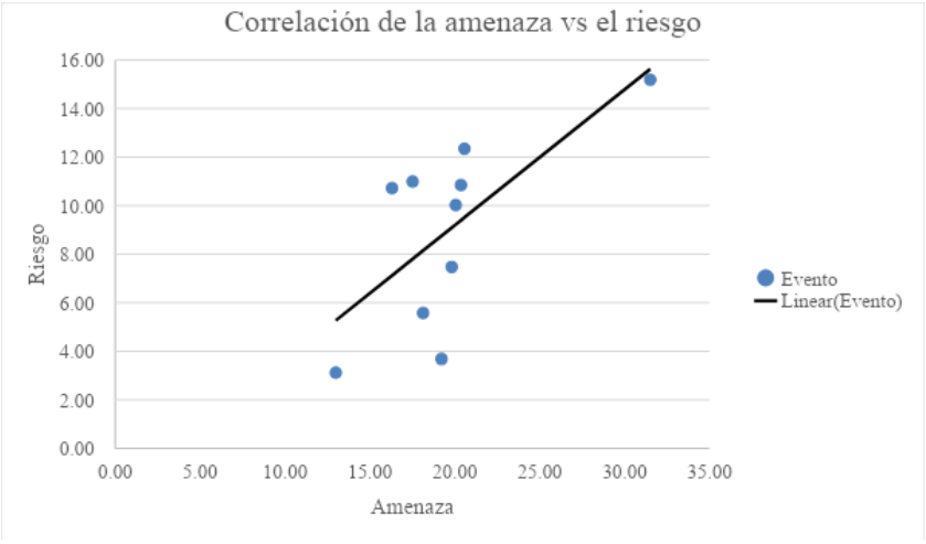 La siguiente gráfica, representa la correlación entre la AMENAZA y el RIESGO, logrando una ecuación que más se ajusta al modelo. Para el evento de inundaciones localizadas en el eje X como una variable independiente, se intercepta la curva y se proyecta hacia la izquierda, determinando el riesgo en el eje Y como una variable dependiente.